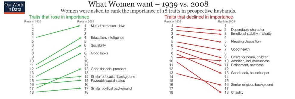 For women, education and intelligence went from 11th in 1939 to fourth, sociability went from 12th to sixth and good looks jumped from 14th to eighth.