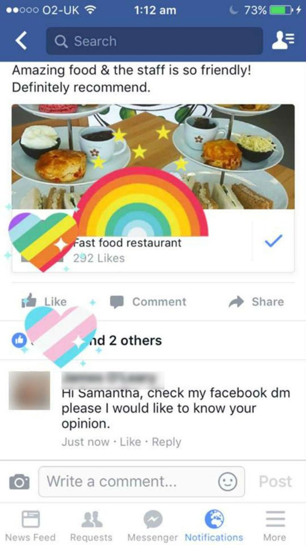 Samantha Mawdsley, a 30-year-old media analyst, got a nasty shock when, after leaving a review for a restaurant on Facebook, one man sent her a message, asking for her "thoughts"