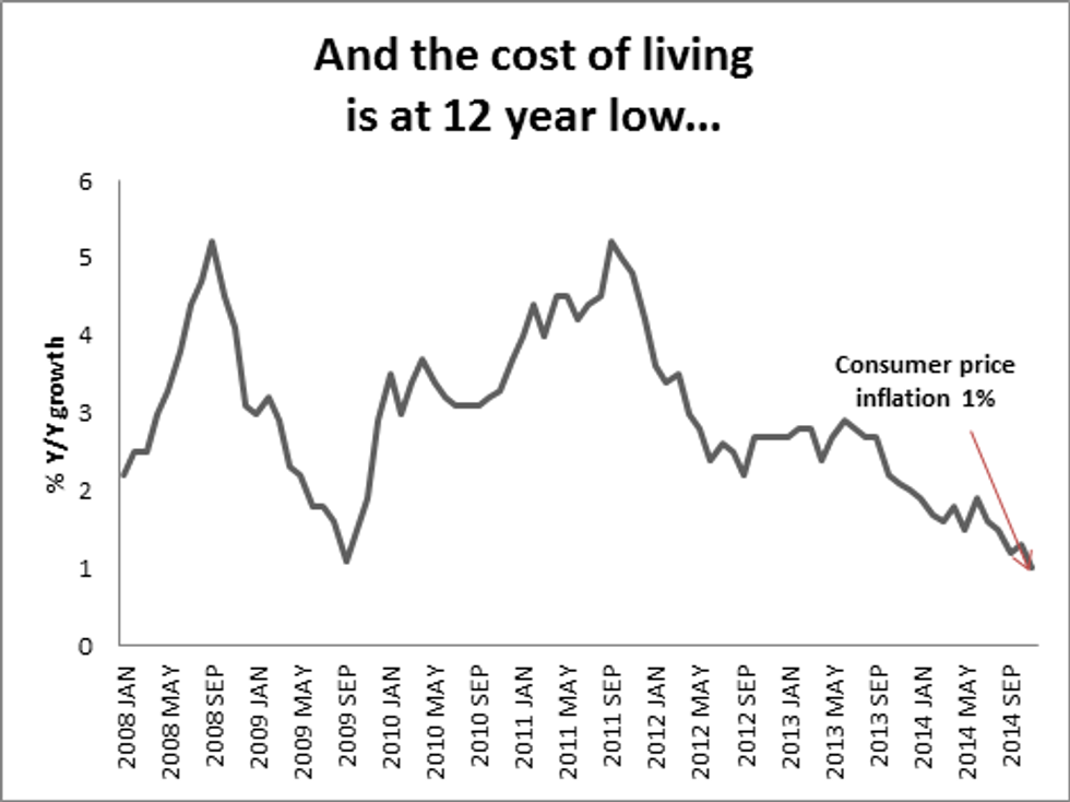 Consumer price inflation has also declined to its lowest since 2002, pushed down by lower global oil prices and the supermarket price war.