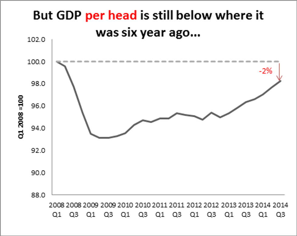 But adjust the GDP figures for the growing UK population and economic output per head is still two per cent below where it was back in 2008.