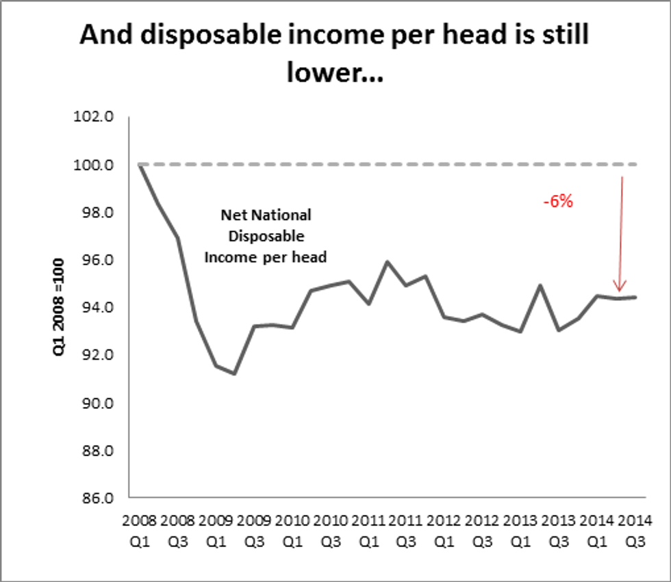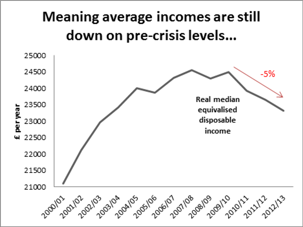 This depressed picture is supported by ONS surveys, which show average household incomes still down five per cent on 2008 levels.