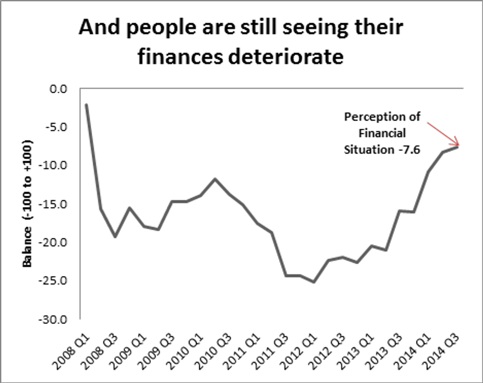 The Eurobarometer consumer survey also asks households about their financial situation over the past 12 months. A negative balance means people’s financial situation got worse. As this final chart shows, although things are deteriorating at a slower rate, the picture is still negative.