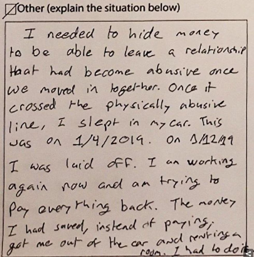 I needed to hide money to be able to leave a relationship that had become abusive once we moved in together. Once it crossed the physically abusive line, I slept in my car. This was on 1/4/2019. On 1/12/19 I was laid off.