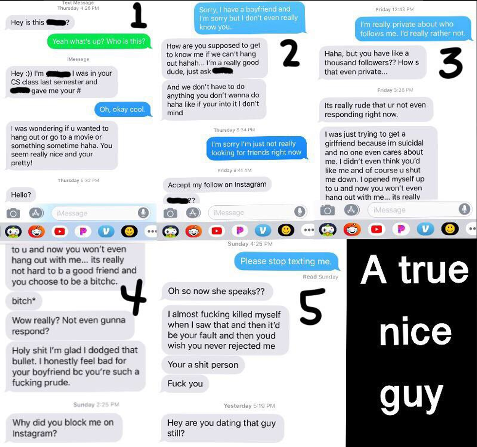 After telling her he’s “a really good dude”, he goes on to demand she accepts his follow on Instagram, tells her he wants a girlfriend because he’s suicidal, and calls her a bitch for not responding.