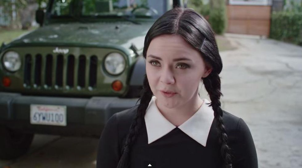 In Melissa Hunter's YouTube series 'Adult Wednesday Addams' the no-nonsense character gets catcalled by two men, and visits them at home with some large and intimidating male friends to get even.
