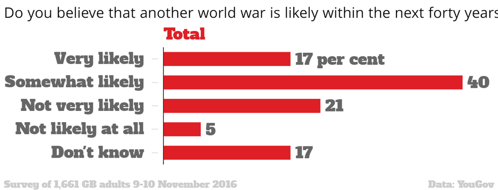 When asked whether they believed another world war was likely in this time frame, 57 per cent of respondents agreed, whereas only 26 per cent said they thought it was unlikely. Of those 1,661 British adults asked: 17 per cent said they did not know.