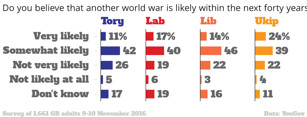 Liberal Democrat and Ukip supporters were also slightly more likely to believe another World War could occur in the next 40 years.