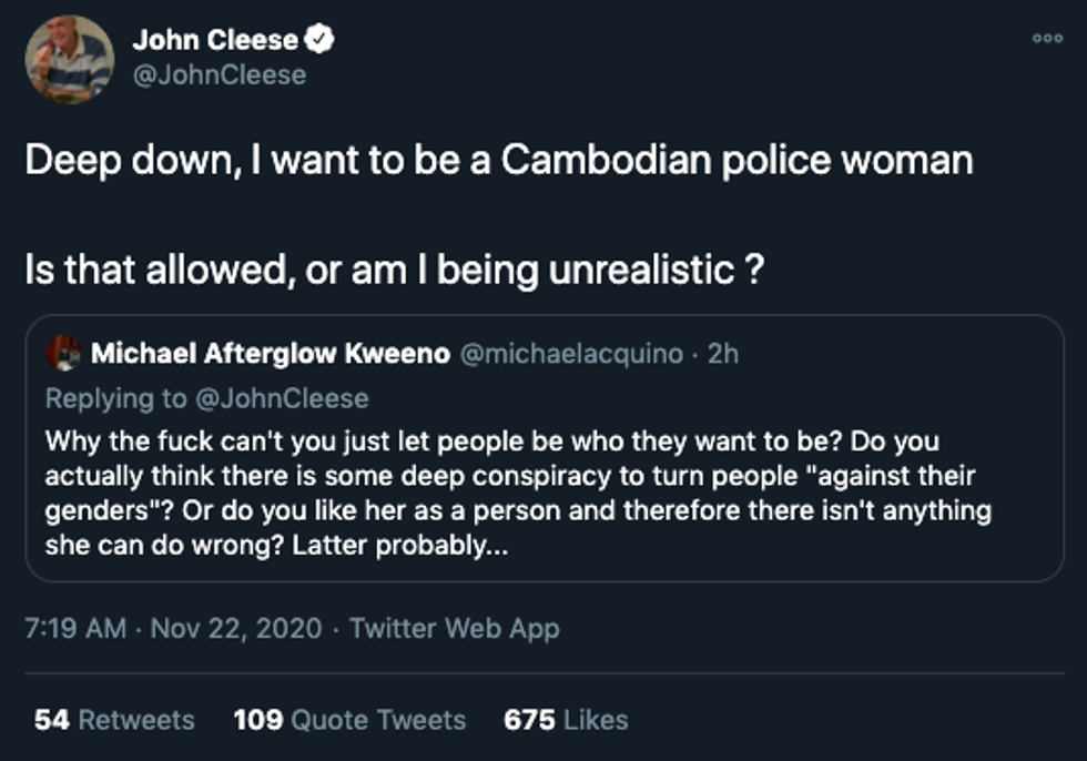 At this point, Cleese’s response seemed to compare trans identities with wanting to “be a Cambodian police woman”, something which many have deemed offensive.
