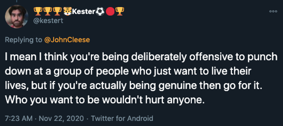 Others pointed out that although Cleese’s analogy has nothing to do with trans rights, if he wants to make a choice for himself that harms no one then yes, that should be absolutely fine:
