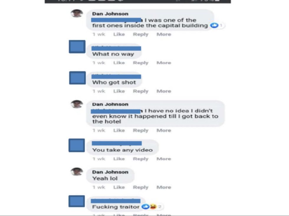 According to screenshots obtained by the FBI, Johnson also wrote on a friend’s Facebook page in comments: “I was one of the first ones inside the capital [sic] building,” to which the friend replied, “f***ing traitor.” In a private message to a different friend, he said “Lol Dad and I were one of the first ones inside.” Both Daniel and his father Daryl have since been charged.