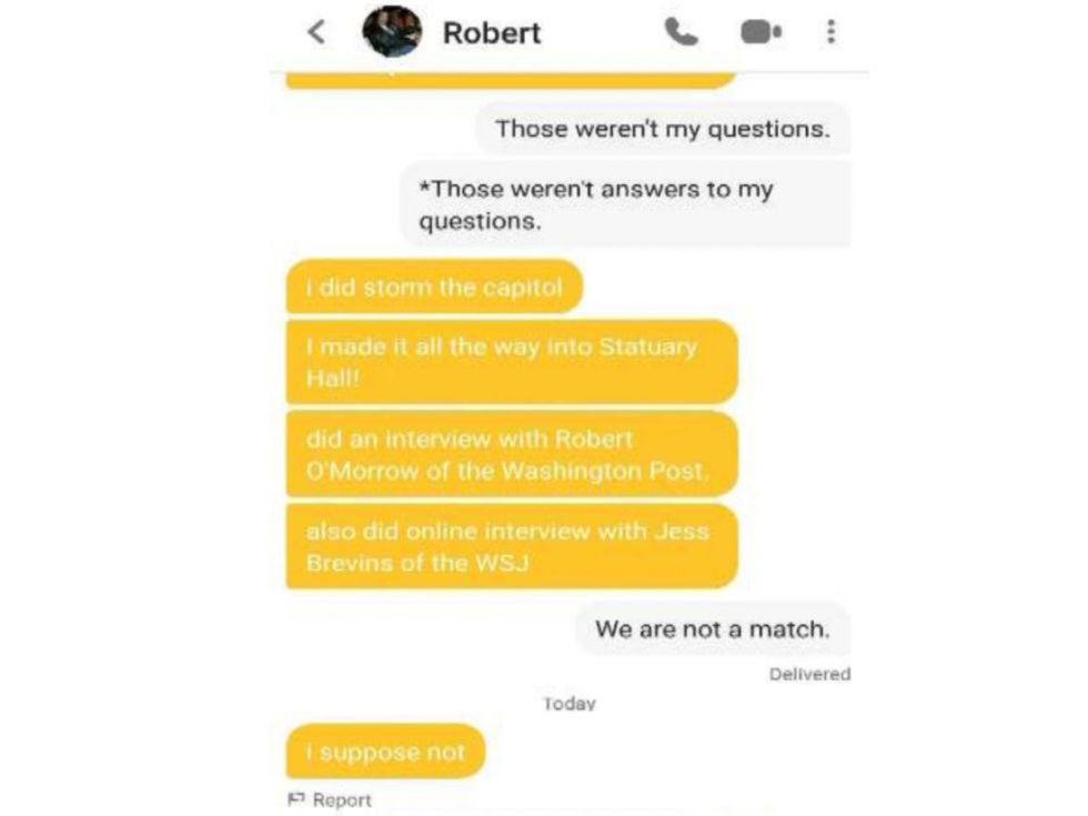Bumble brought down New York’s Robert Chapman, as well. On Jan. 13, Chapman matched with someone on Bumble and boasted of his involvement with the storming of the Capitol.