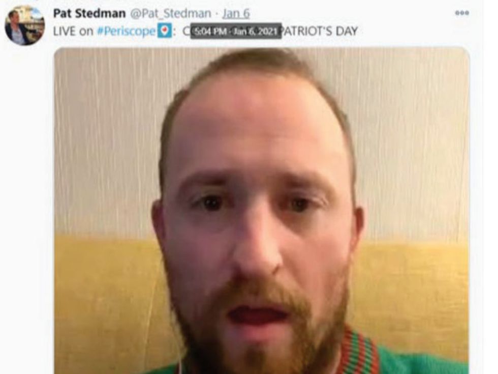 Pat Stedman told on himself via Twitter. On Jan. 6, Stedman posted a video, blatantly discussing his participation in the riots: “I was pretty much in the first wave, and we broke down the doors and climbed up the back part of the Capitol building, and got all the way into the chambers,” he said. He posted several live videos from the scene, as well.