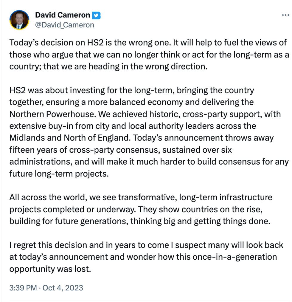 Cameron, writing on X/Twitter, said: “Today’s decision on HS2 is the wrong one. It will help to fuel the views of those who argue that we can no longer think or act for the long-term as a country; that we are heading in the wrong direction.”