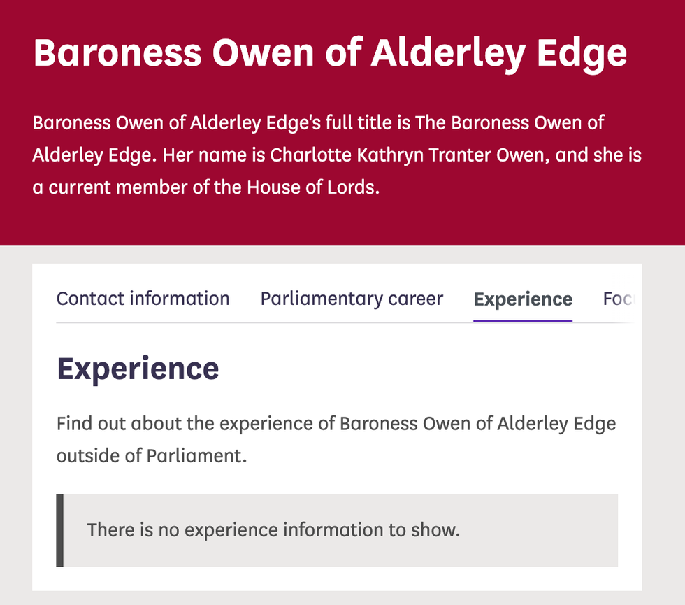 Slightly awkwardly, at the time of writing Baroness Owen’s simply reads: “There is no experience information to show.”