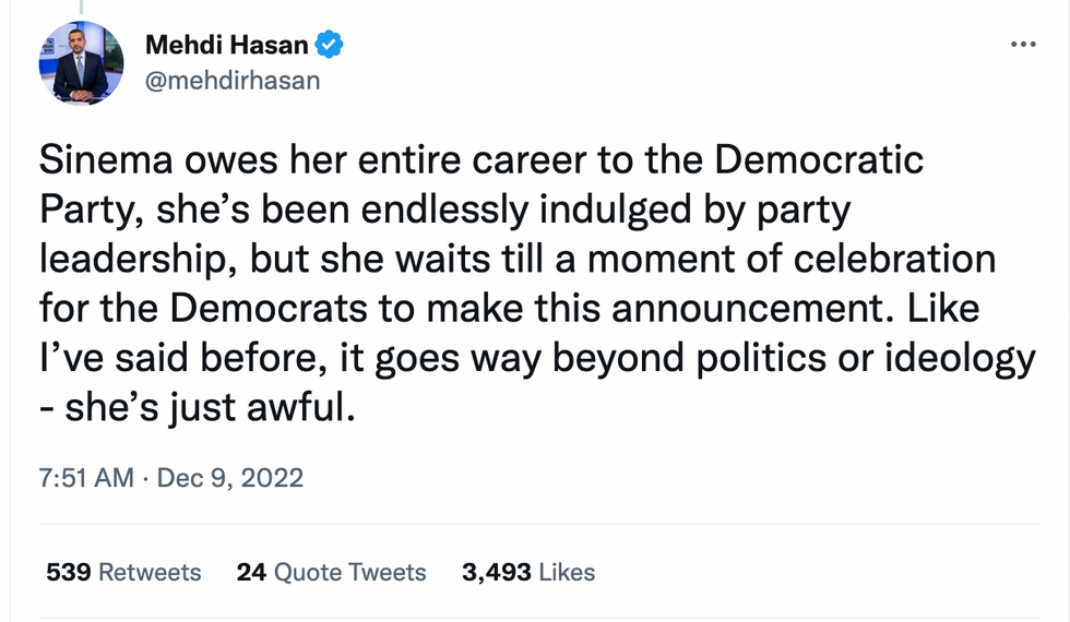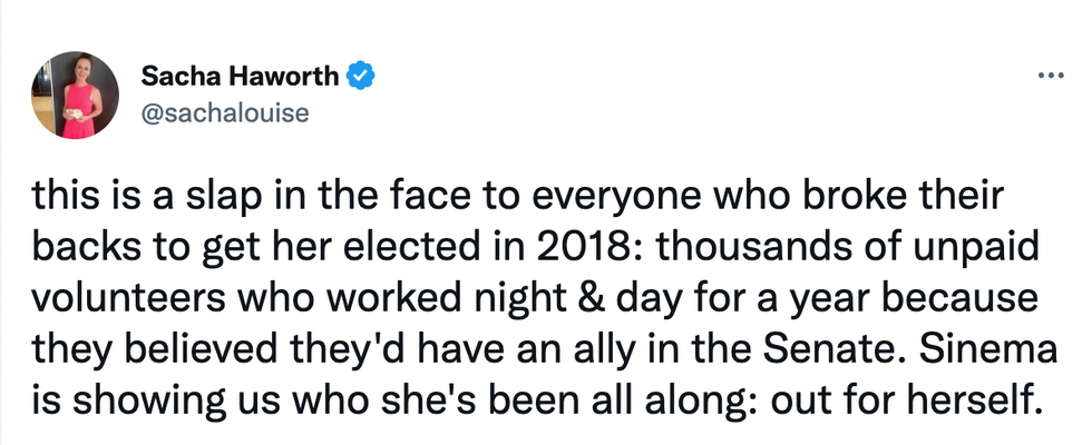 On Twitter, people criticized Sinema's move, accusing the Arizona Senator of taking advantage of the Democratic Party to obtain her seat but rejecting loyalty.