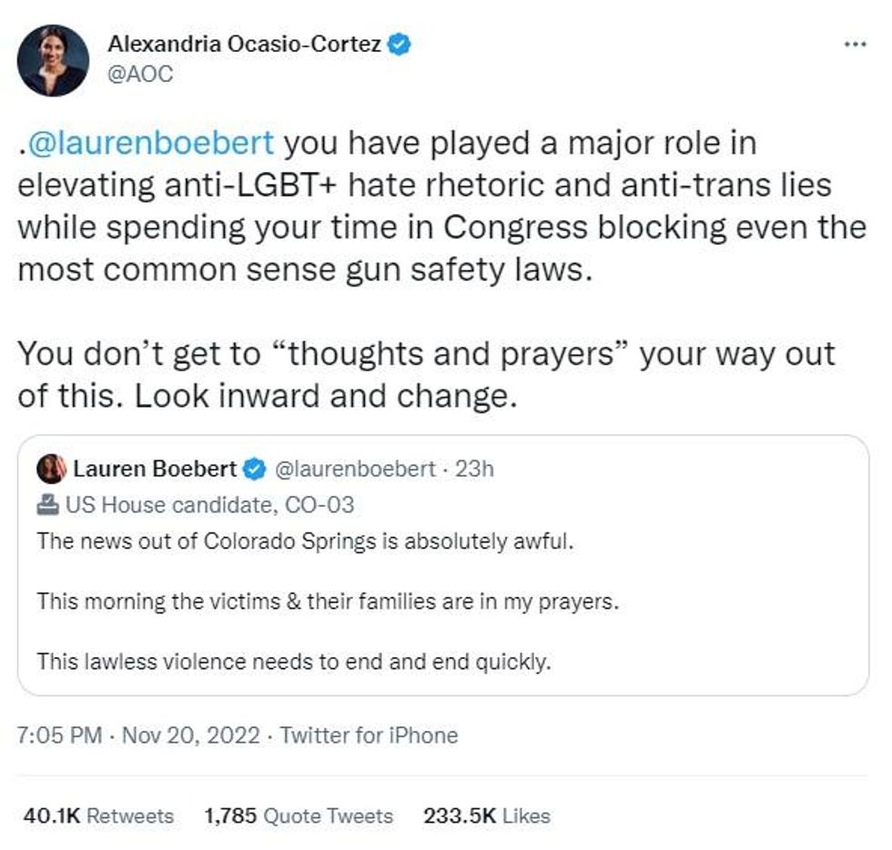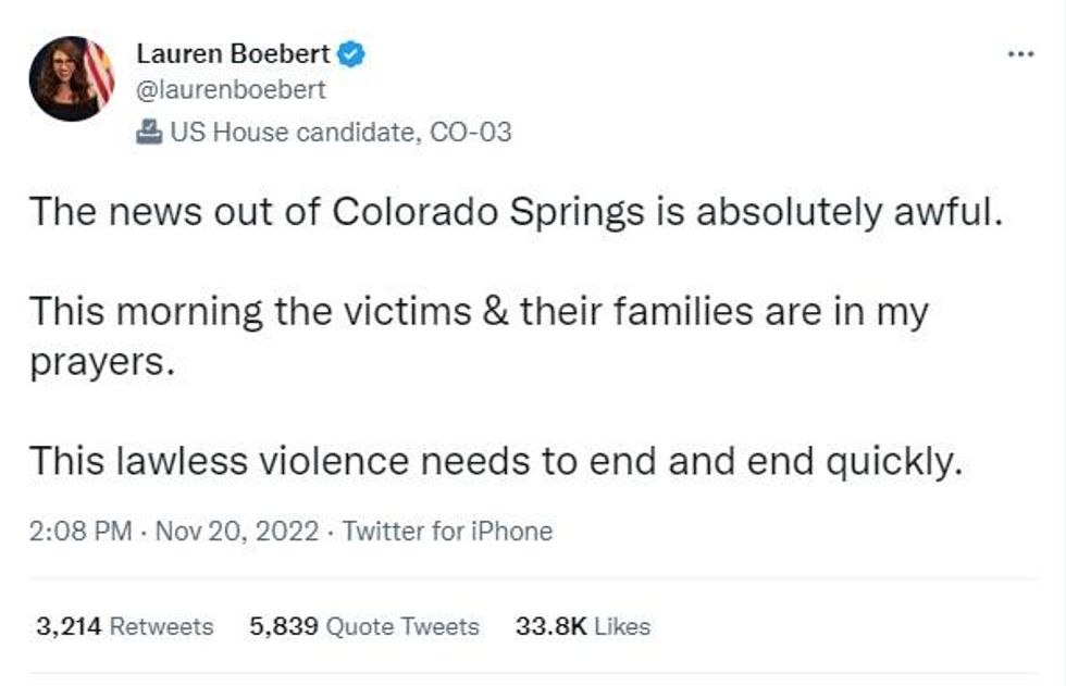 "The news out of Colorado Springs is absolutely awful,” Boebert wrote. “This morning the victims & their families are in my prayers. This lawless violence needs to end and end quickly.”