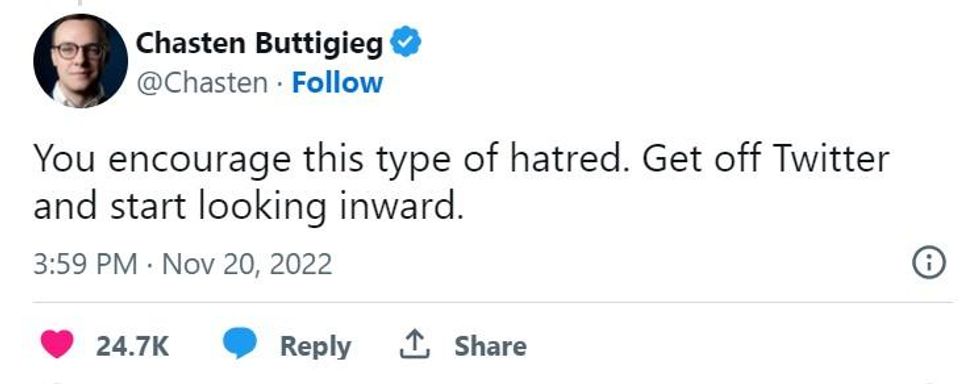 "You encourage this type of hatred. Get off Twitter and start looking inward," he tweeted.