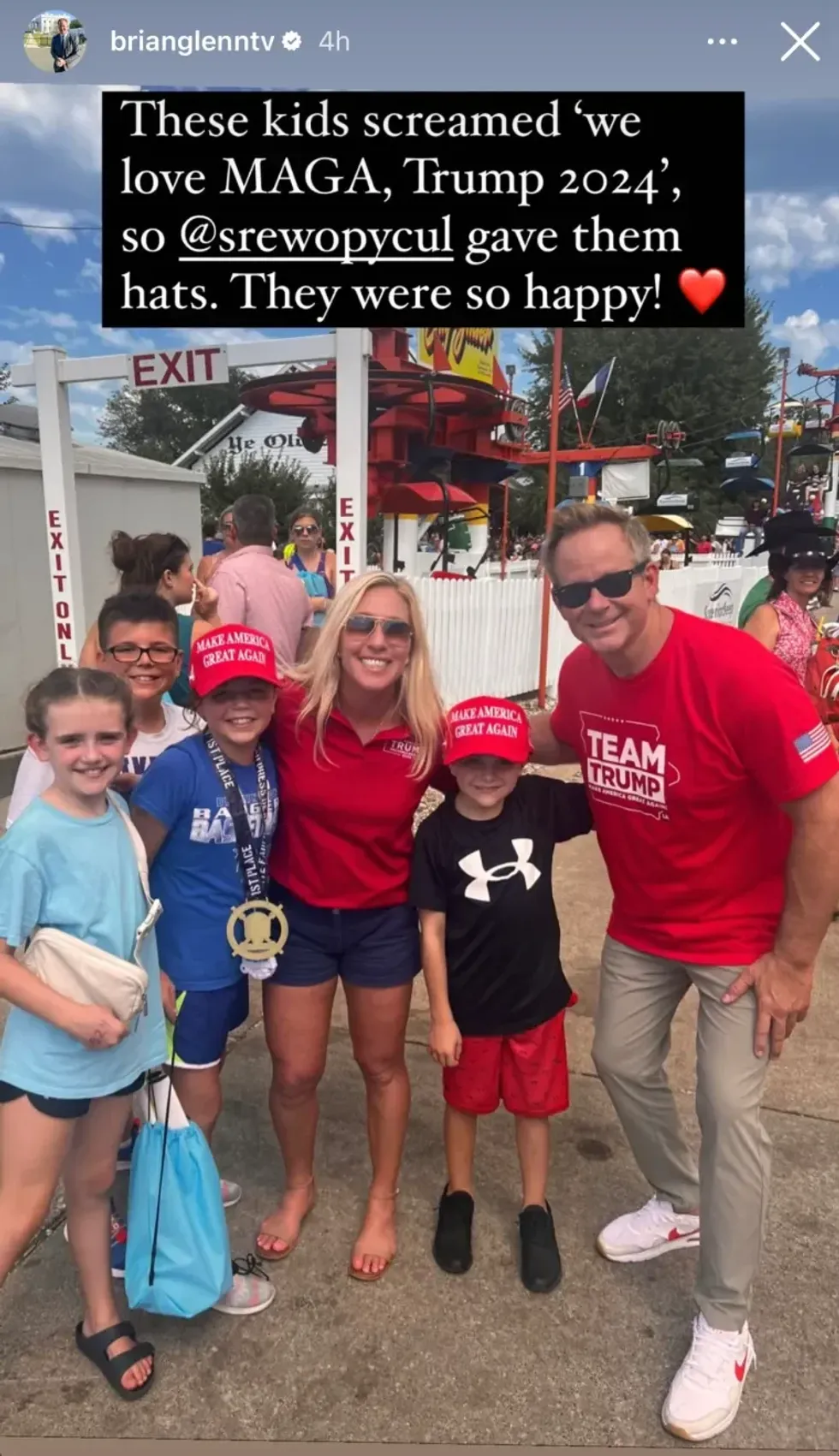 Glenn posted a photo of himself, Green and four children with the caption “These kids screamed ‘we love MAGA, Trump 2024’ […] They were so happy!”