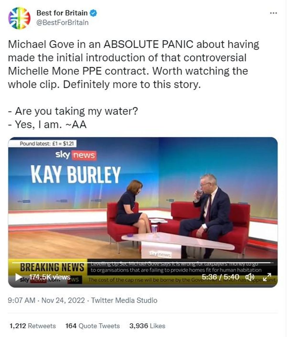 Michael Gove needed a glass of water after being grilled by Kay Burley but he ended up drinking from the presenter's glass.