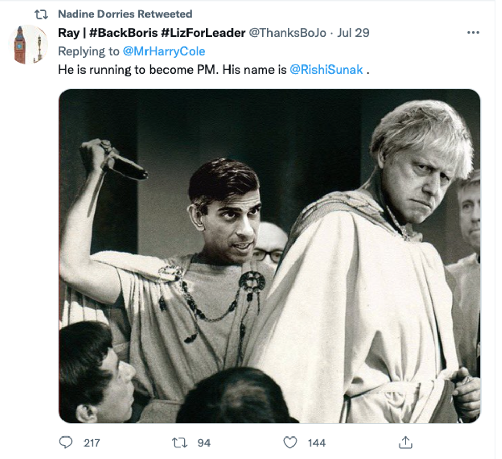 The photoshopped image appears to be a recreation of the assassination of the Roman emperor Julius Caesar in 44 BC. Dorries, who at the time of writing has not removed the retweet, appears to have got it from a pro-Boris Johnson Twitter account which is now supporting Liz Truss for leader.