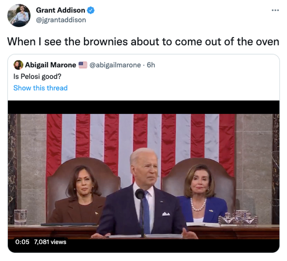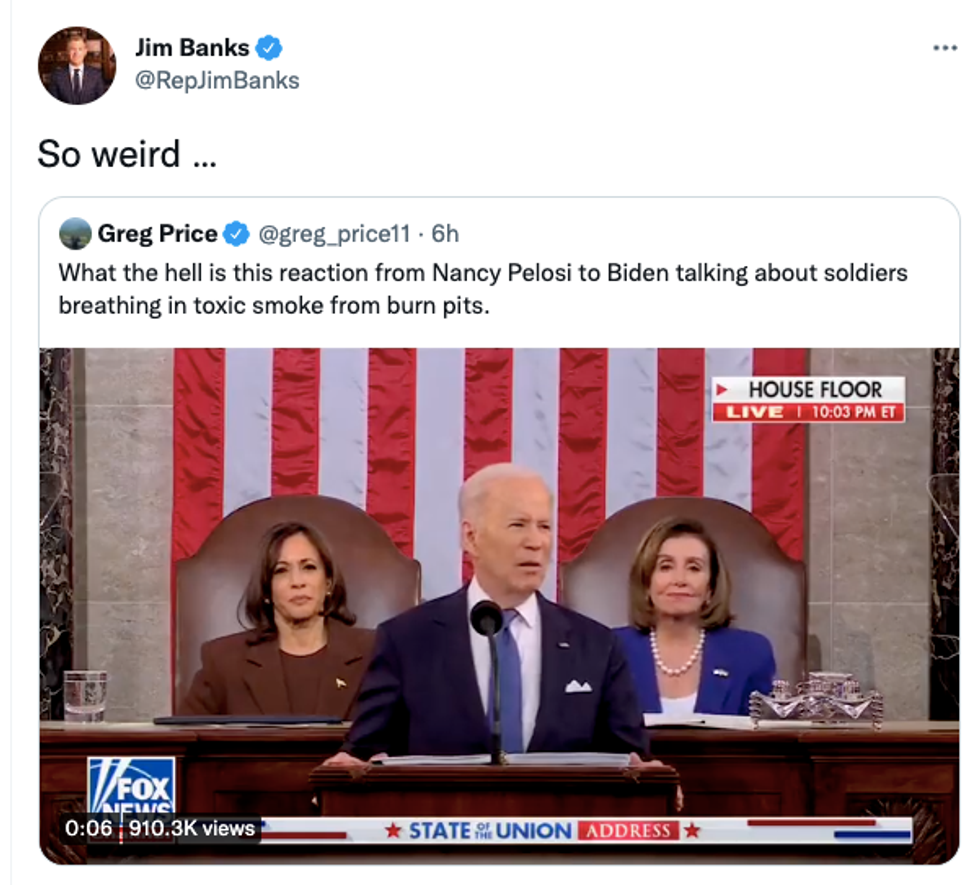 Digital strategist Greg Price retweeted the clip and wrote: “What the hell is this reaction from Nancy Pelosi to Biden talking about soldiers breathing in toxic smoke from burn pits.”
