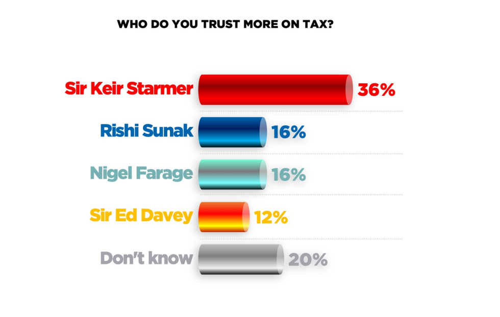 According to the poll, 36 per cent said they'd trust Starmer most on tax. Then, 16 per cent said they'd trust Sunak more on tax.