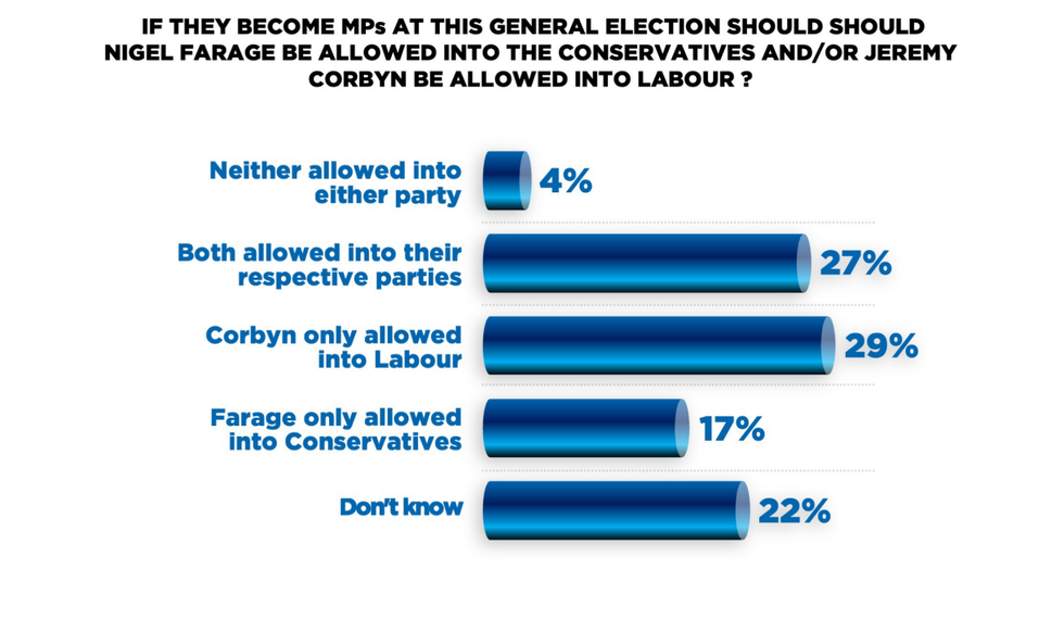 Next, people in the poll were asked "if they became MPs at this general election, should Nigel Farage be allowed into the Conservatives and/or Jeremy Corbyn be allowed into Labour?"