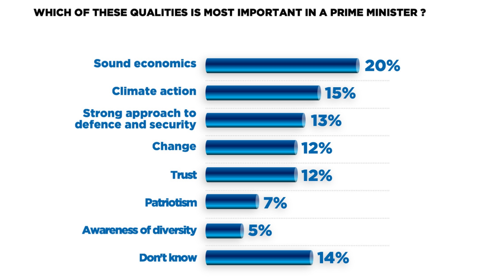 'Sound economics' scored 20 per cent, 'climate action' scored 15 per cent, 'strong approach to defence and security' scored 13 per cent, while 'change' scored 12 per cent.
