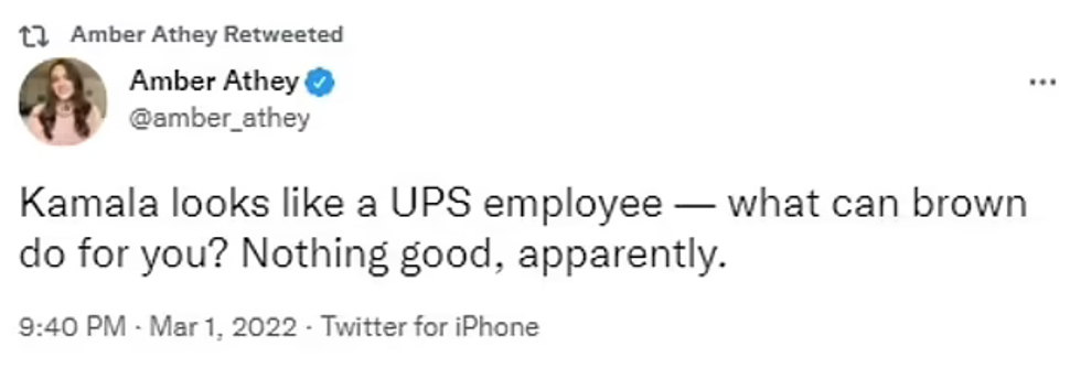 “Kamala looks like a UPS employee — what can brown do for you? Nothing good, apparently,” she wrote in a tweet on March 1, referencing a former UPS tagline.
