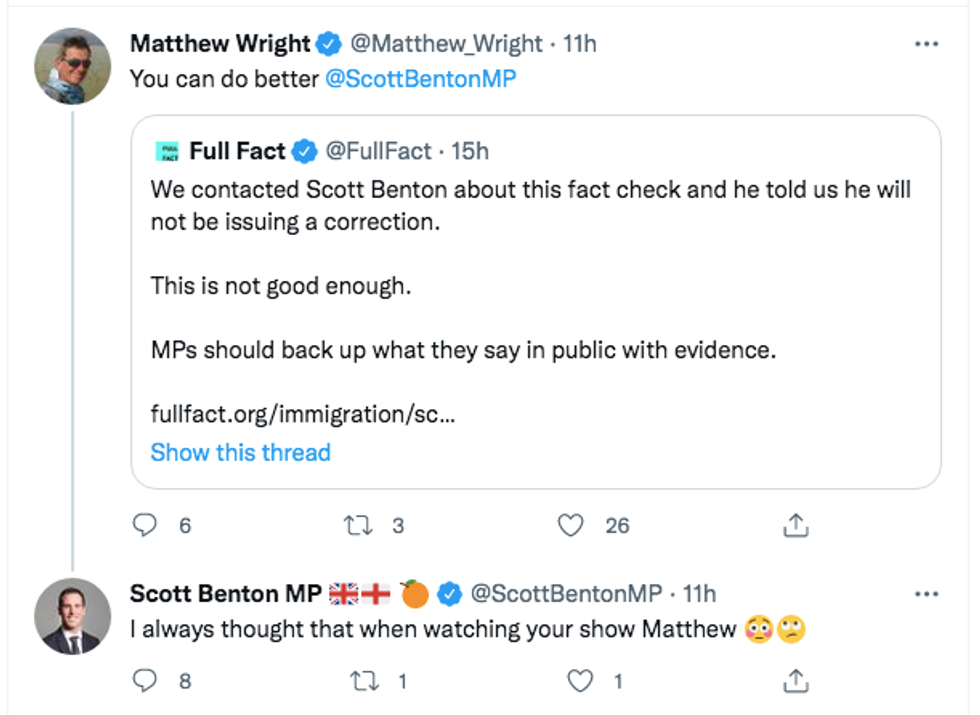 Journalist and presenter Matthew Wright quote tweeted the post from Full Fact and called out Benton by writing: “You can do better @ScottBentonMP.”
