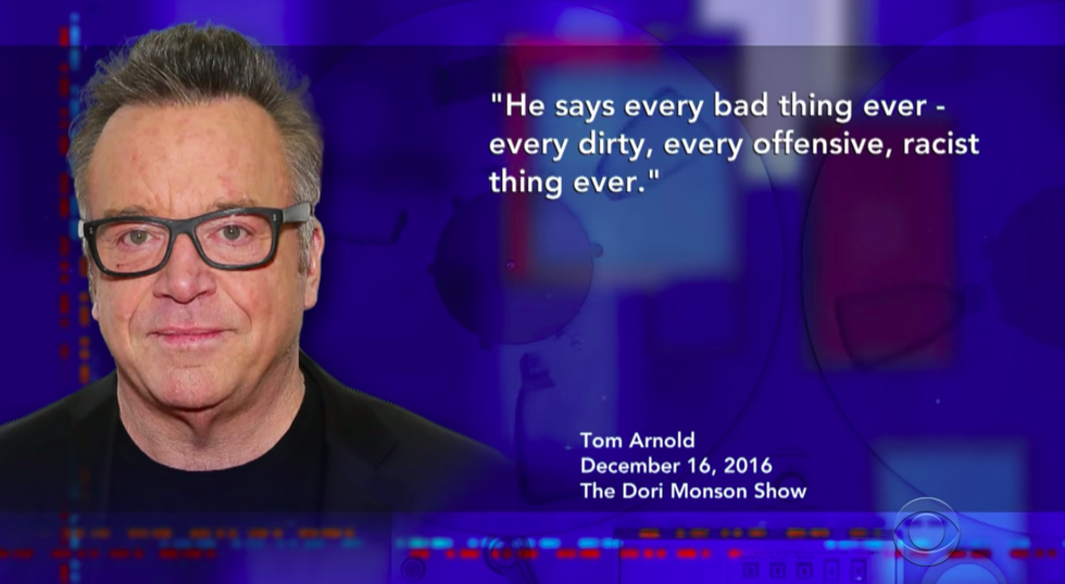 “See, for years, there have been allegations about outtakes from The Apprentice where the Slob Father uses racist language, including by (actor) Tom Arnold, who says he saw it personally,” Colbert explains.