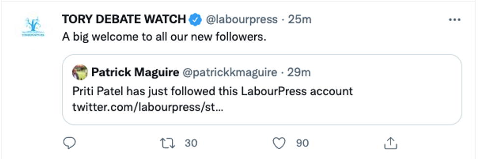 Interestingly, Home sectary Priti Patel started following the account not long after this. Keep your friends close etc, etc...
