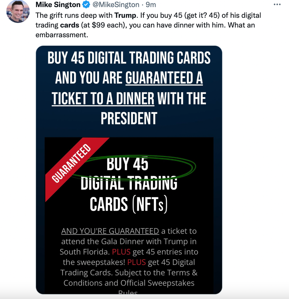 Each time a person purchases one, they're automatically entered into sweepstakes with prizes like dinner with Trump in Miami, a one-on-one meeting with Trump, a golf game with Trump, hand-signed memorabilia, a zoom call with Trump, "golden edition signed e-trading cards", and more.