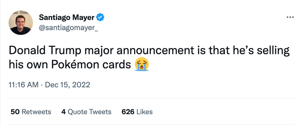 \u201cWait.......THIS was #Trump 's "major announcement" today???\n\nNot Speaker of the House, but some Digital Trading cards?!\n\nWell, as Jan Hooks once beautifully said on SNL...\u201d— John Rocha aka The Outlaw Nation (@John Rocha aka The Outlaw Nation) 1671122607