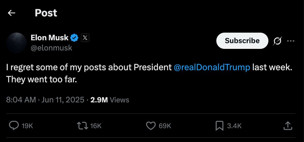 It looks like Musk wants to, as he's been reflecting on his actions, taking to his platform X to share his "regret" about the posts he made about Trump.