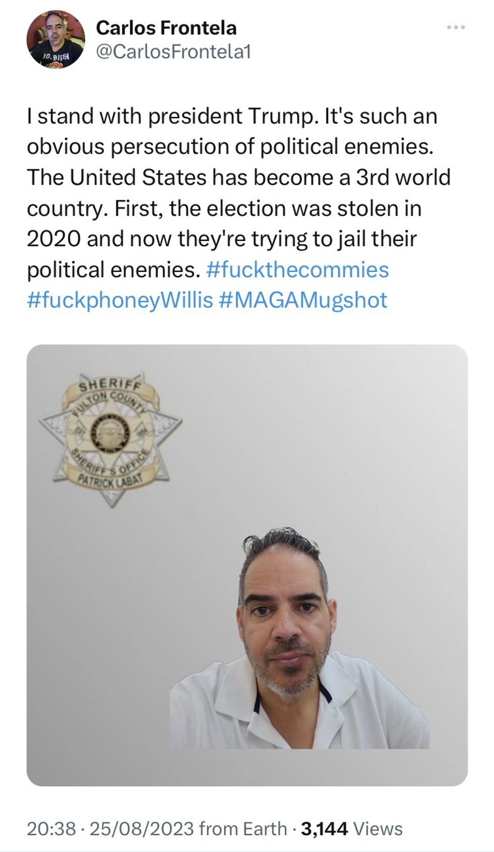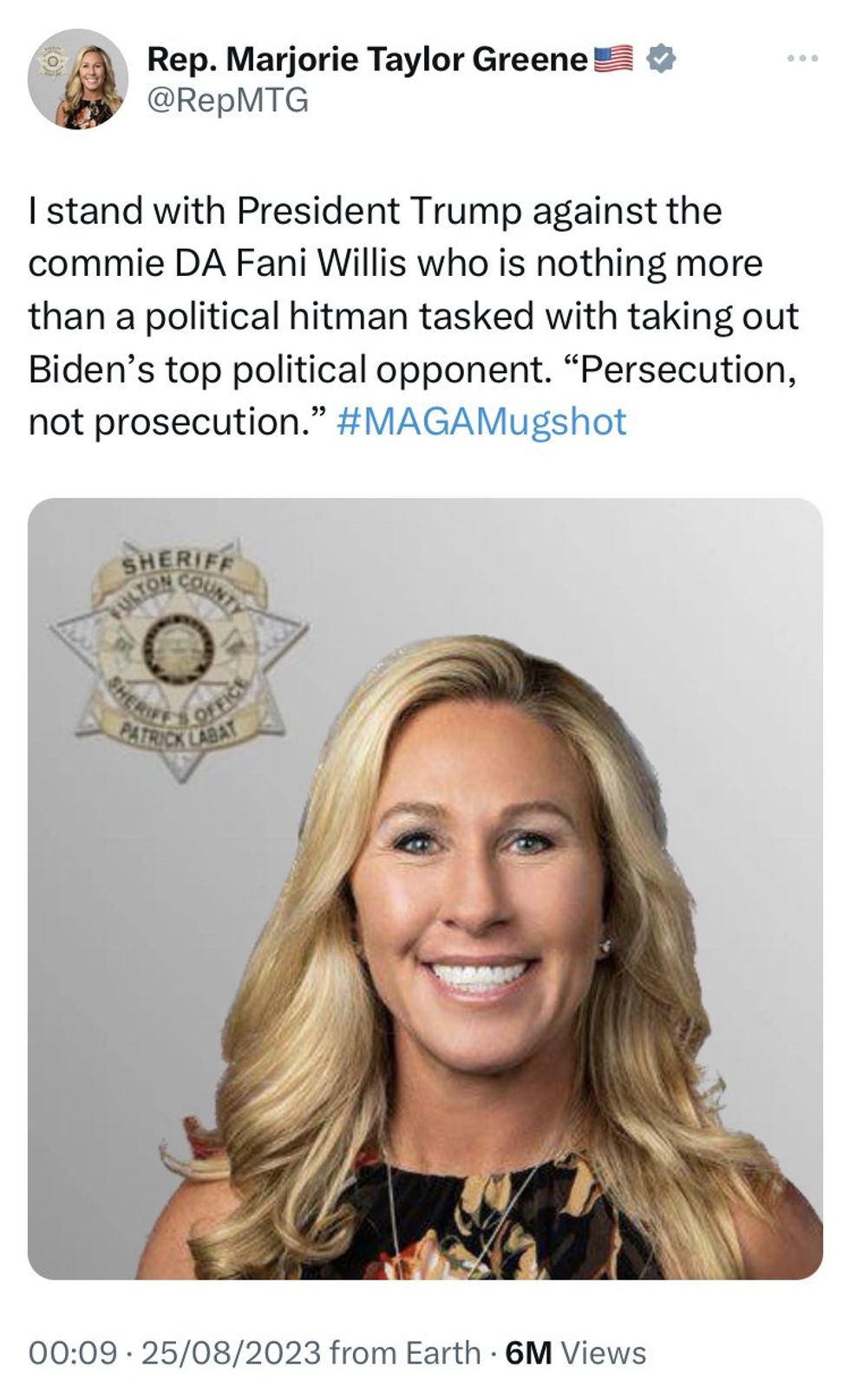 “I stand with President Trump against the commie DA Fani Willis who is nothing more than a political hitman tasked with taking out Biden’s top political opponent. ‘Persecution, not prosecution.”’