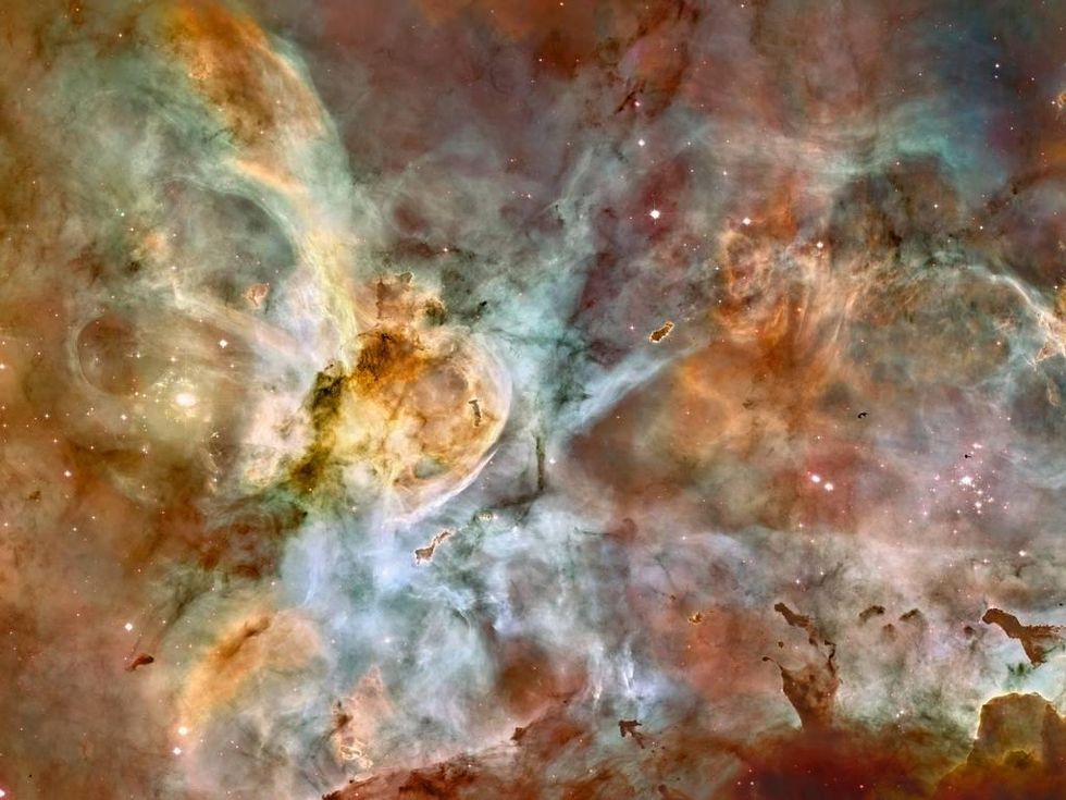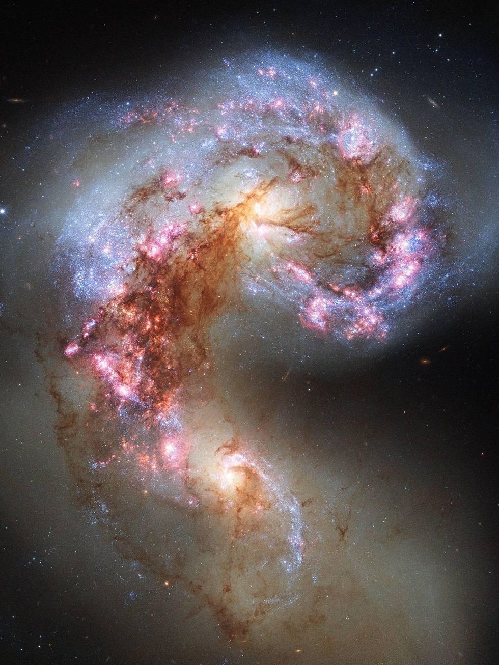 This Hubble image of the Antennae galaxies is the sharpest yet of this merging pair of galaxies. As the two galaxies smash together, billions of stars are born, mostly in groups and clusters of stars. The brightest and most compact of these are called super star clustersThe Carina Nebula. Outflowing winds and intense ultraviolet radiation from the large stars shape the material that is the last vestige of the giant cloud from which the stars were born