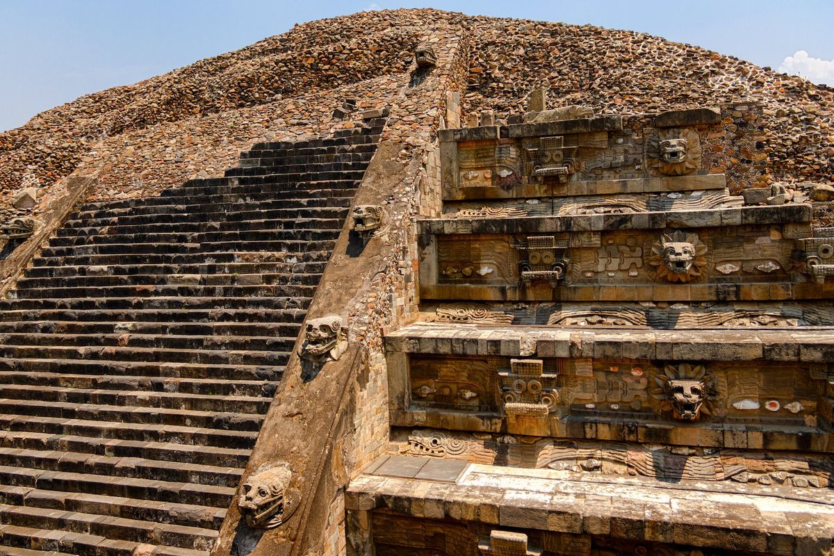 The Quetzalcoatl temple (otherwise known as the Feathered Serpent Pyramid) in the ancient city of Teotihuacan, Mexico, is estimated to have been built around 800 and 1,900 years ago.