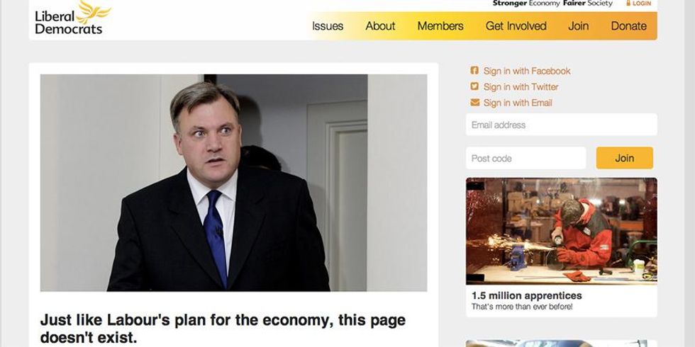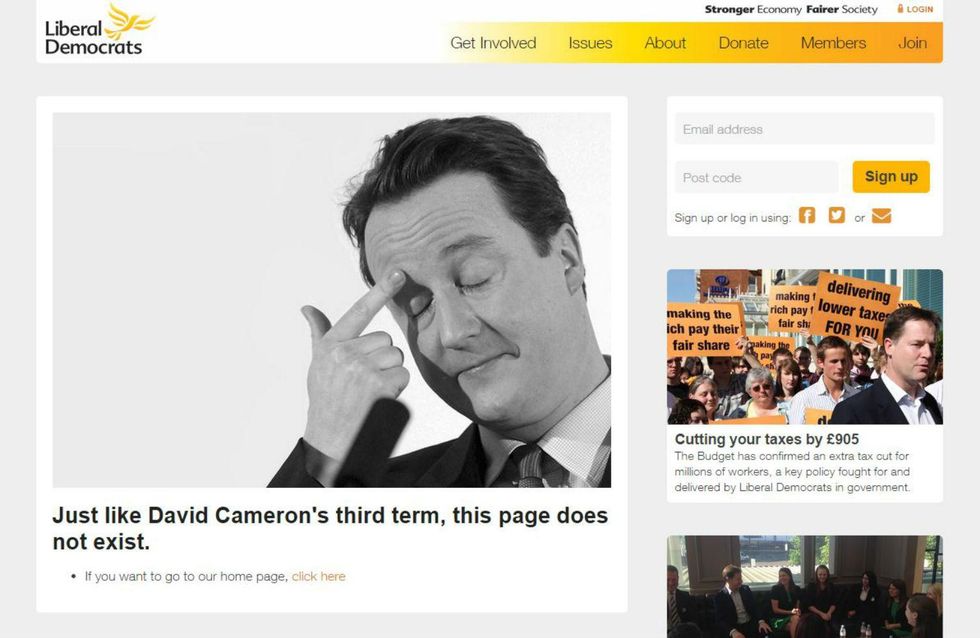 But behold, the clever souls at Lib Dem HQ (fresh in the wake of creating Danny Alexander's big yellow briefcase and Nick Clegg's oh-so-funny Uptown Funk mash-up) have made this 404 error page on their website.