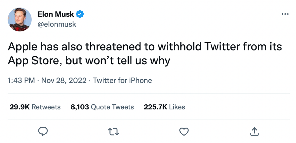 Following their sit down, Musk said, "Tim was clear that Apple never considered" removing Twitter from the App Store.