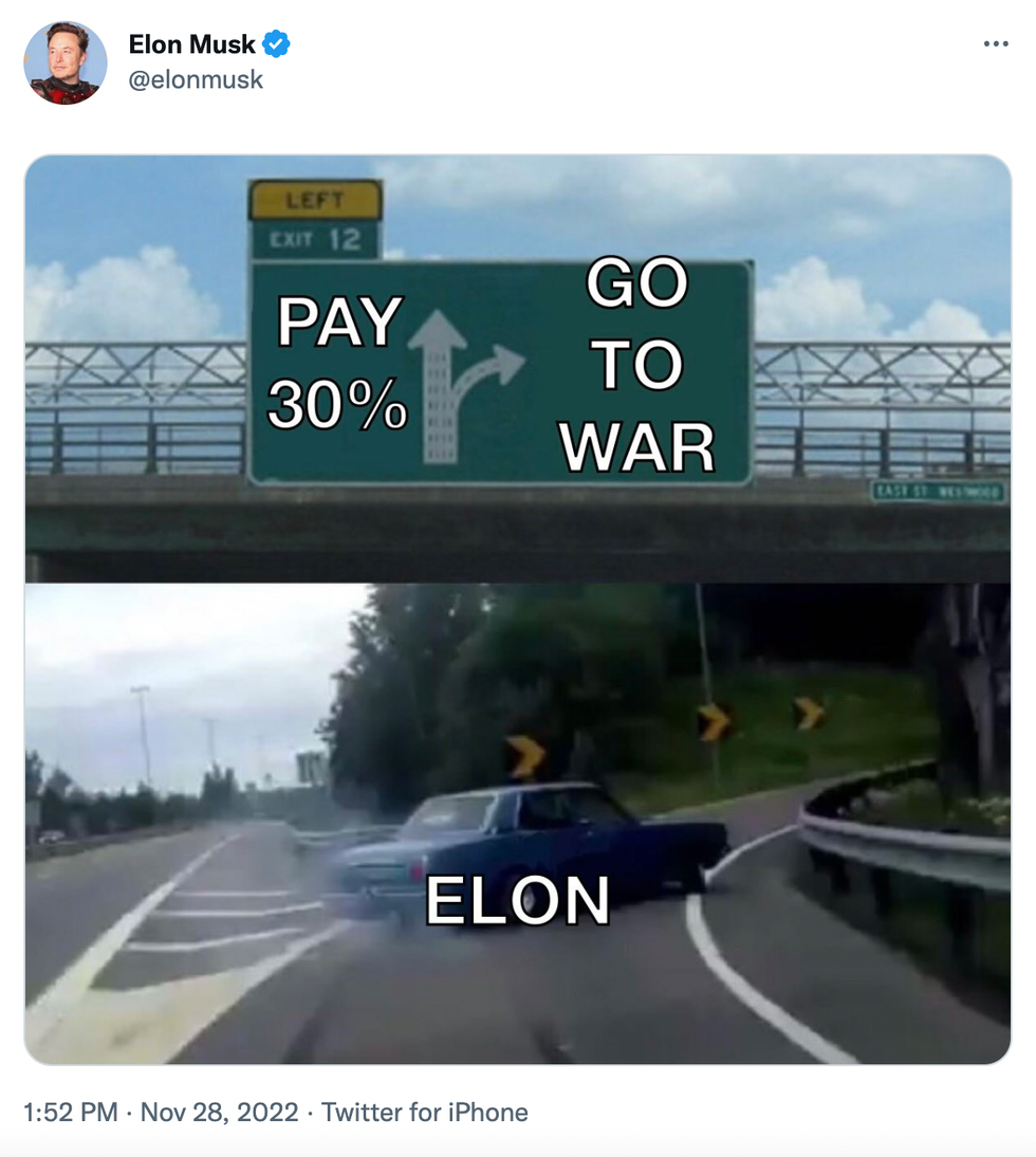 Posted a meme to Twitter, Musk insinuated he would "go to war" with Apple rather than pay the 30 percent fee.