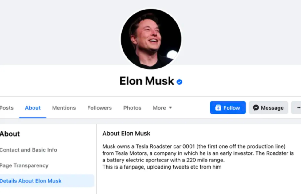 A Facebook fan page for Elon Musk was verified as an official page but then it disappeared.