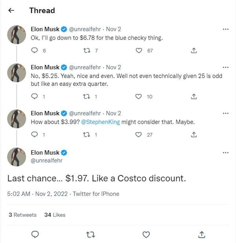 "Ok, I'll go down to $6.78 for the blue checky thing," another imposter account @unrealfehr as he bargained on the new monthly subscription, and in the thread eventually went down to $1.97 "Like a Costco discount."