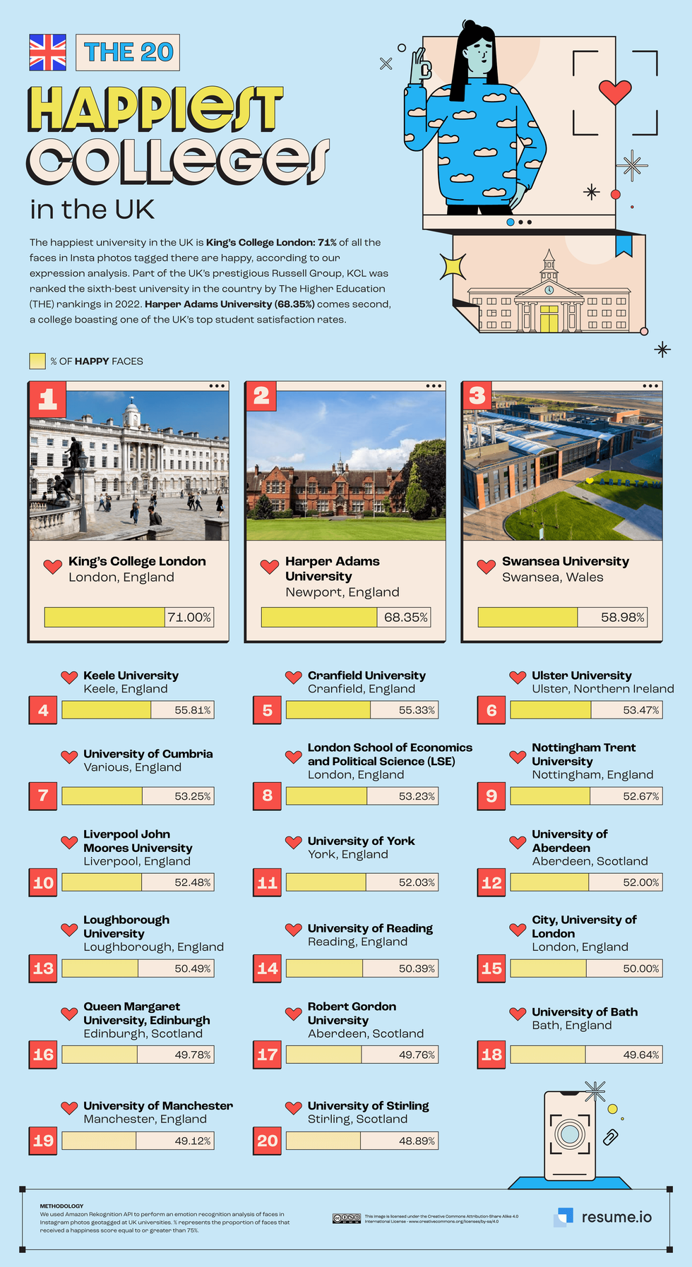 King’s College London is King with 71 per cent of faces registered as happy in Instagram photos tagging this uni, which is sixth-best university in the country according to Times Higher Education University Rankings 2023.