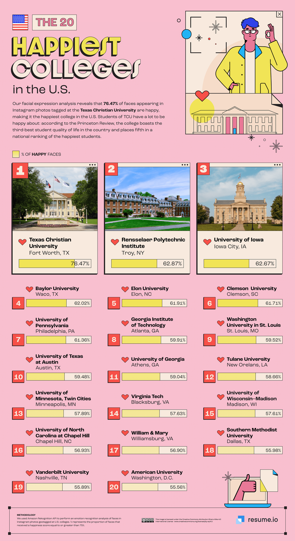 Analysts at Resume.io were able to calculate this based on the percentage of faces seen in selfies taken by students and faculty members that express happiness.