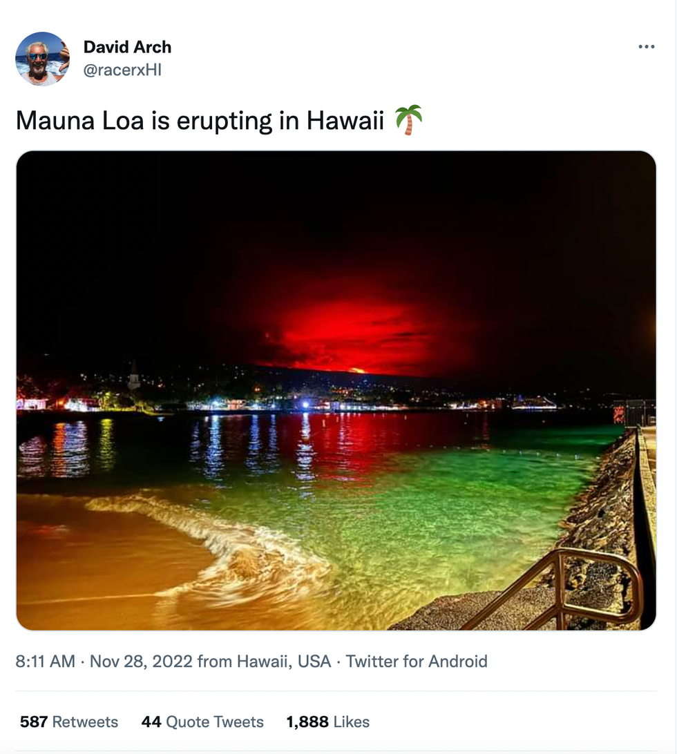 \u201cHawaii volcano eruption 2022. \n\nThe world's largest active volcano erupts in Hawaii after 40 years.\u201d— Mandy News (@Mandy News) 1669706909