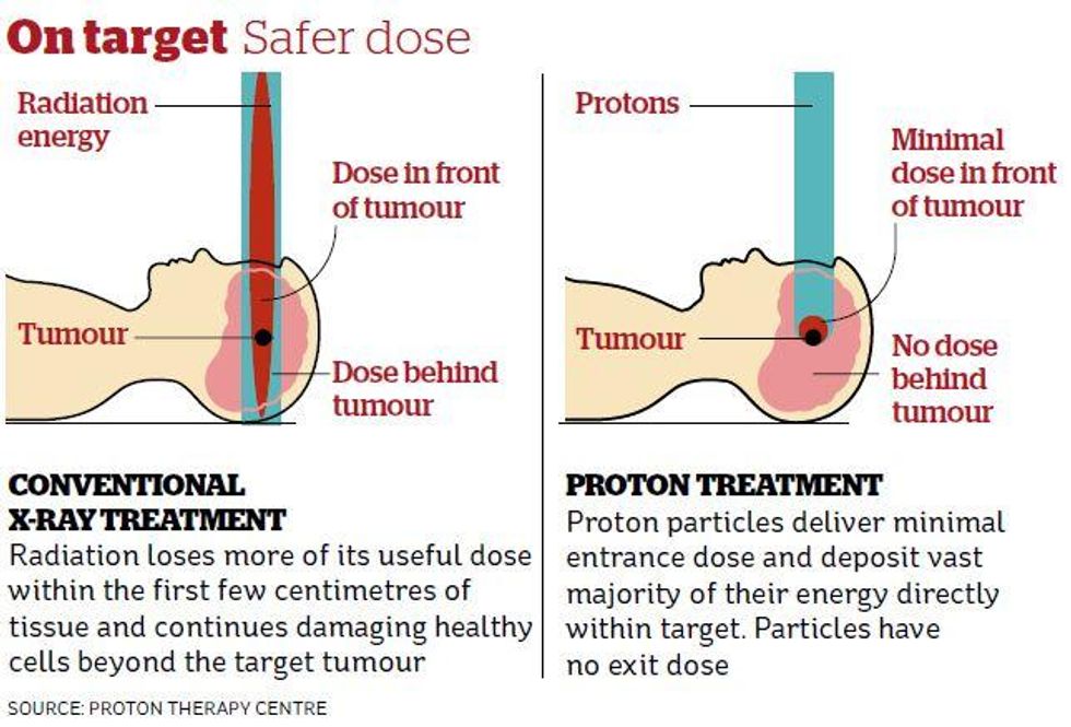 This fundamental difference in the physics of proton-beam therapy means that most of its energy of the fast-moving proton particles is delivered directly at the site of the tumour.