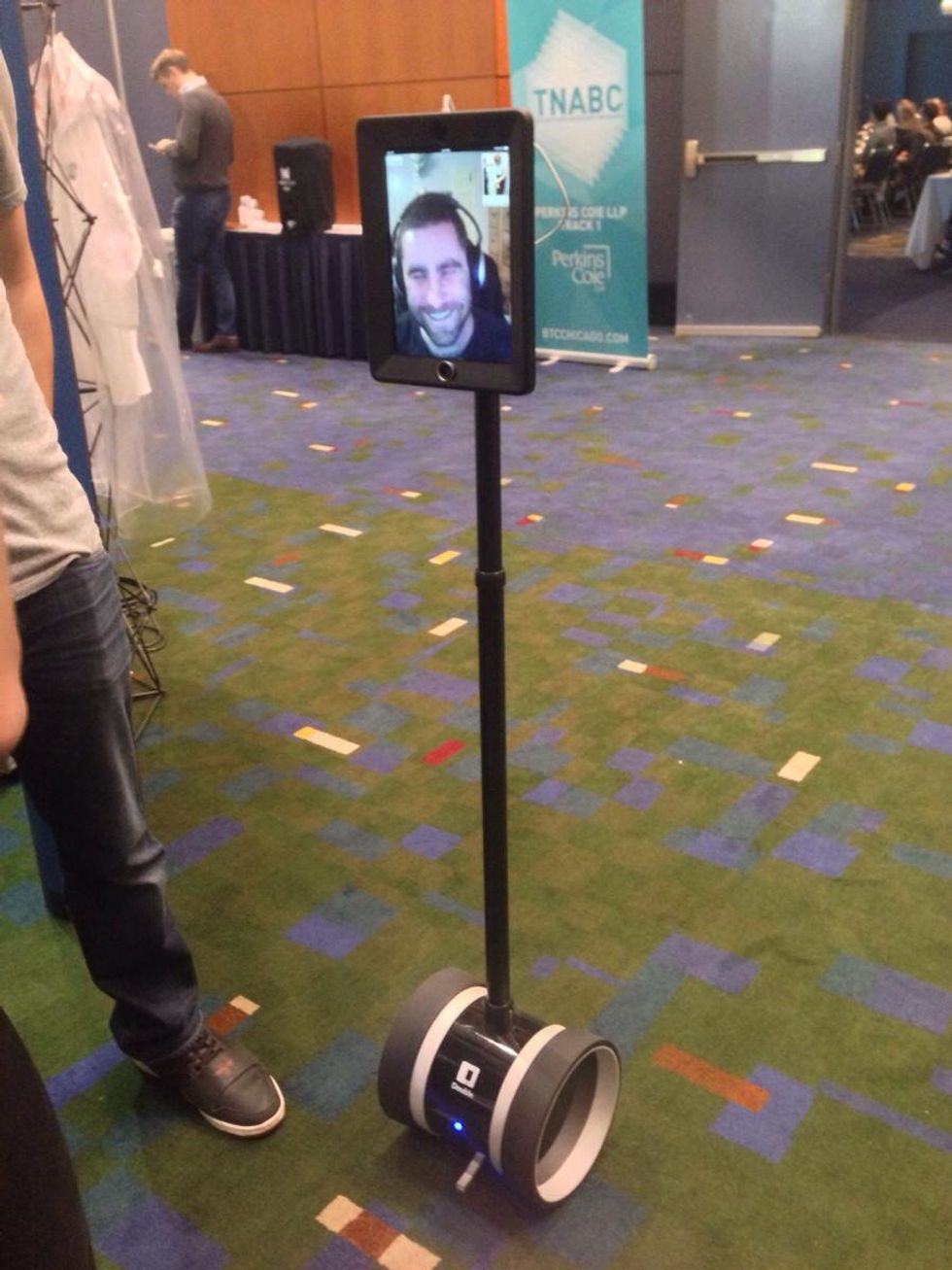 But he managed to circumvent the house arrest by trundling around the convention corridors on what is best described as a combination between an iPad and a Segway.