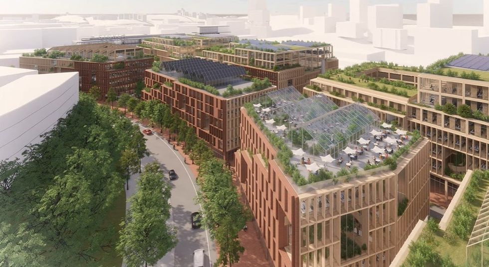 It will use the largest amount of fire-proofed mass timber in a project of this kind with 7,000 office spaces and 2,000 homes, along with shops and restaurants being built.