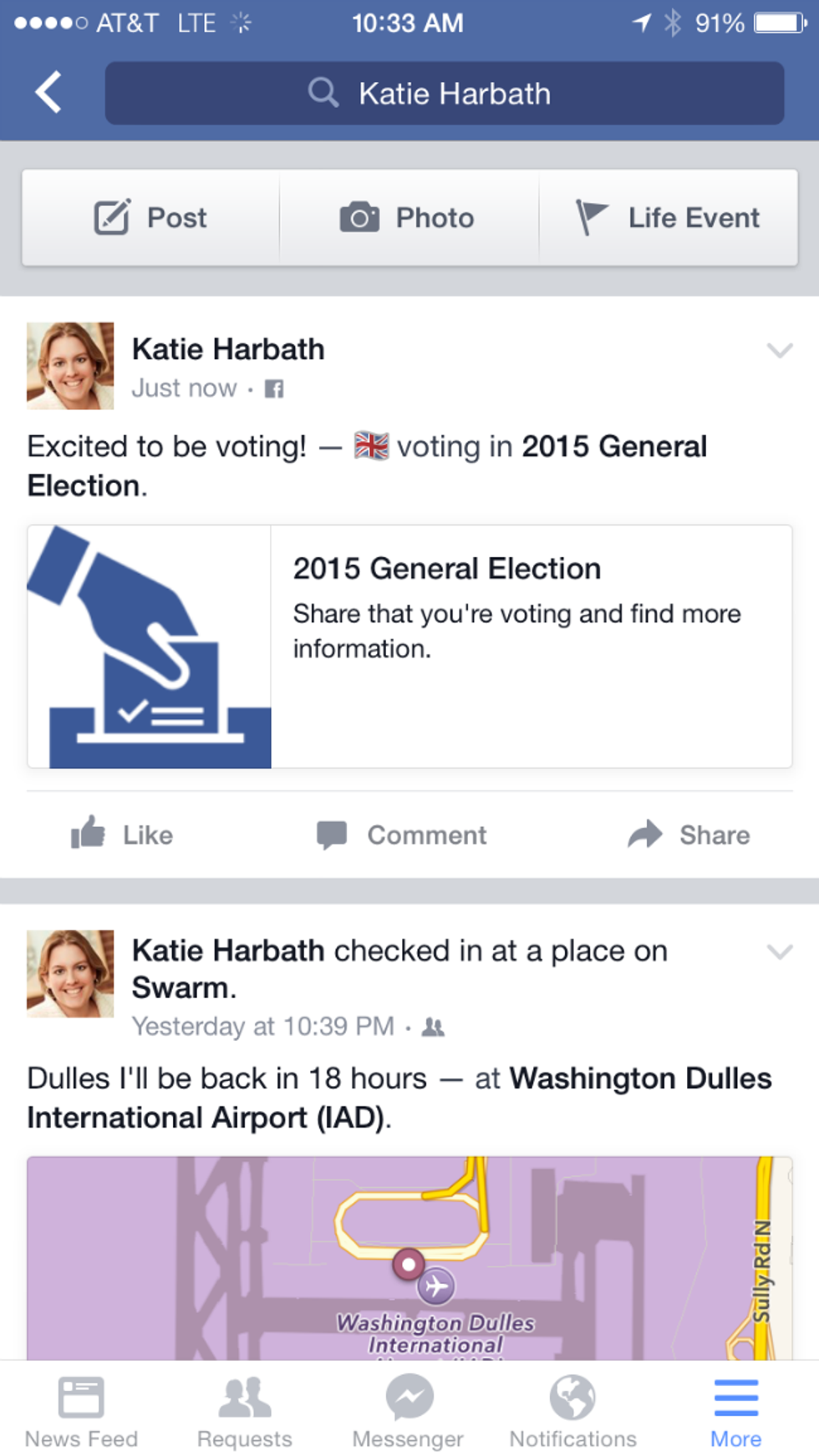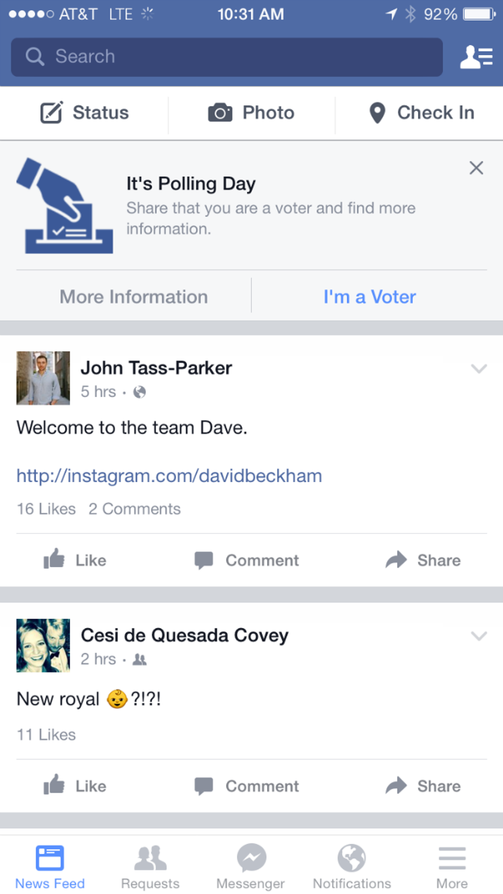 Elizabeth Linder, politics and government specialist for Facebook, said: "Politics is huge on Facebook, and with over 52 million interactions related to the general election already this year, we fully expect it to be the most discussed topic in the UK in 2015. That's why we're rolling out the 'I'm a Voter' button ahead of polling day – to give people all over the UK to chance to share they they're taking part with friends and family – and encourage others to do the same."